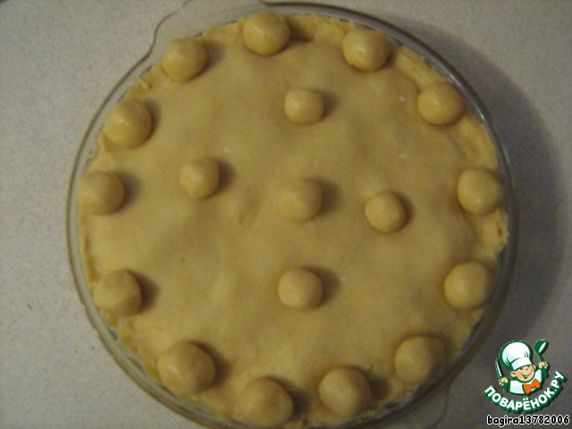 Раскатываем остаток теста и накрываем пирог. Прижимаем края теста и остаток срезаем ножом.