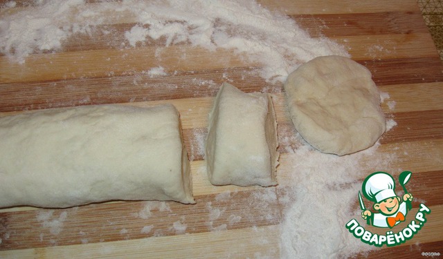 Тесто раскатать "колбаской", нарезать на брусочки и раскатать их.