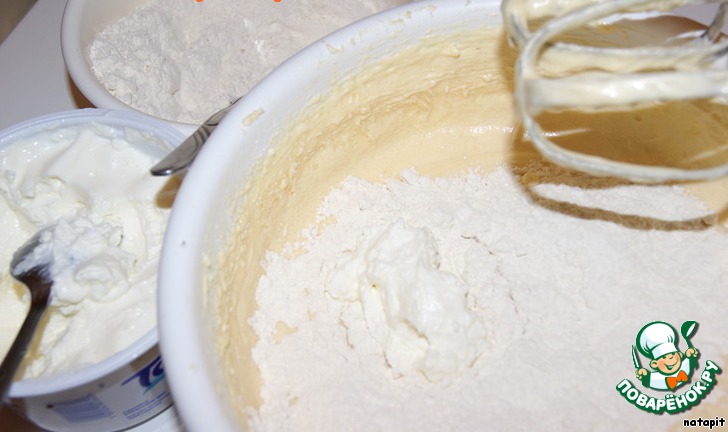 На малой скорости миксера небольшими порциями ввести йогурт, чередуя его с мукой.
