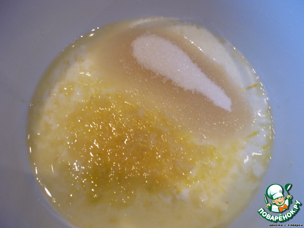 Взбить йогурт, цедру и сок 1,5 лимонов и 100 г сахара.