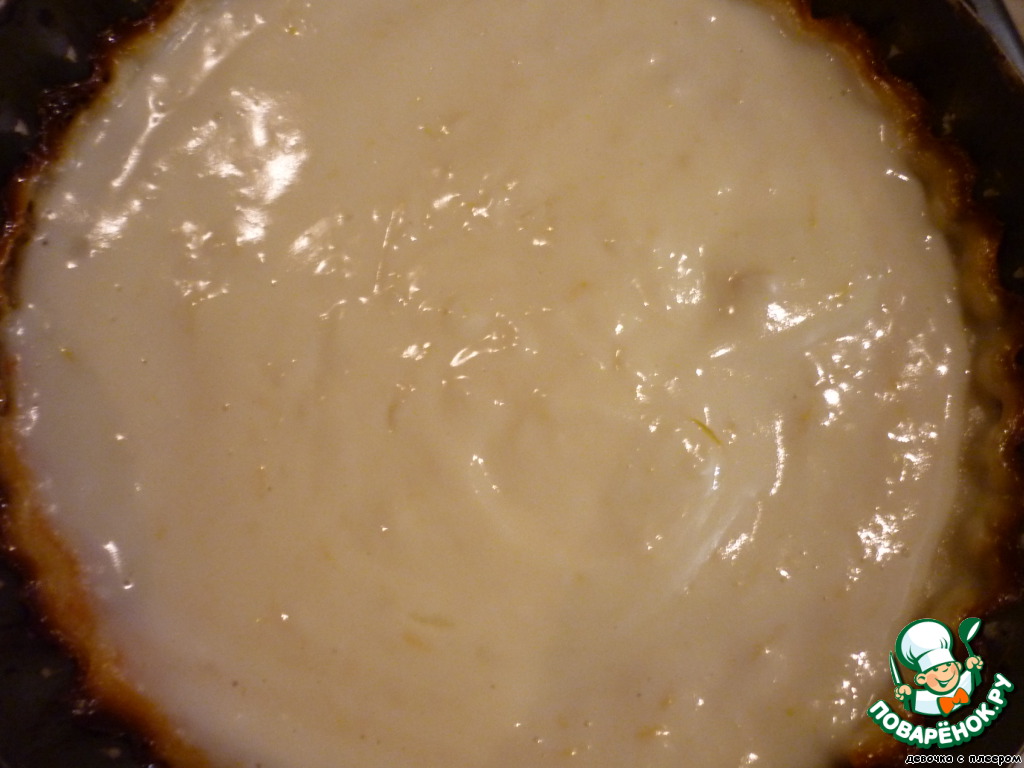 Пирог вынуть из духовки, сверху выложить заварной крем, остудить и убрать на 3-4 часа в холодильник.