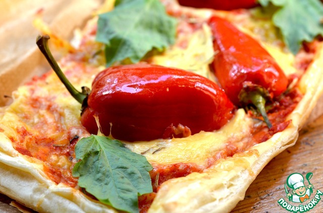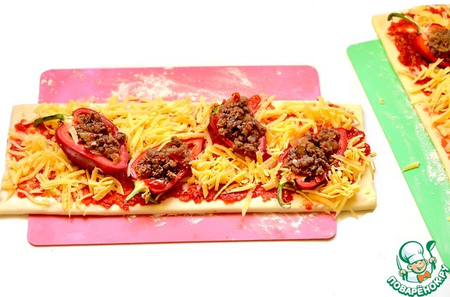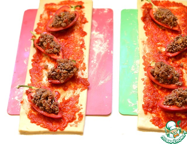 Слоёное дрожжевое тесто раскатать, смазать соусом из помидор. Перчины разрезать на пополам, вынуть семена, заполнить фаршем и выложить на тесто фаршем вверх.
