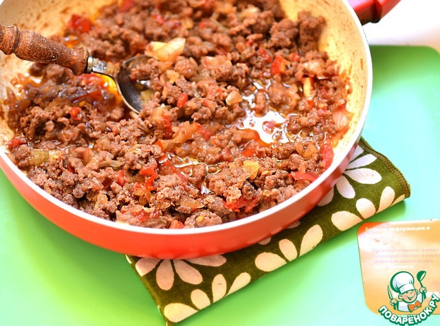 1 помидор, лук мелко нарезать. Соединить с фаршем. Добавить соевый соус для жарки. Поперчить. Обжарить в сковороде с добавлением 1 ст. л растительного масла до испарения жидкости с помидора (3-4 минуты).