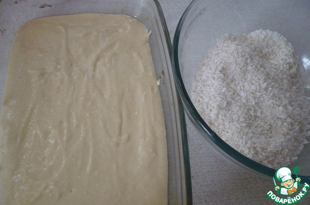 Для теста смешать кефир, яйцо, сахар, соду и муку. Форму смазать маслом, выложить тесто. В отдельной посуде смешать кокосовую стружку, сахар и ванилин. Если у Вас духовка не современная и трудно выставить t, то лучше использовать не стекло. А если делаете в разъемной форме, то застелите форму пергаментом. Это для того, чтобы когда поливаете сливками, они не вытекли из формы.