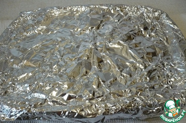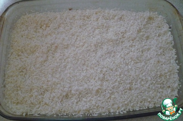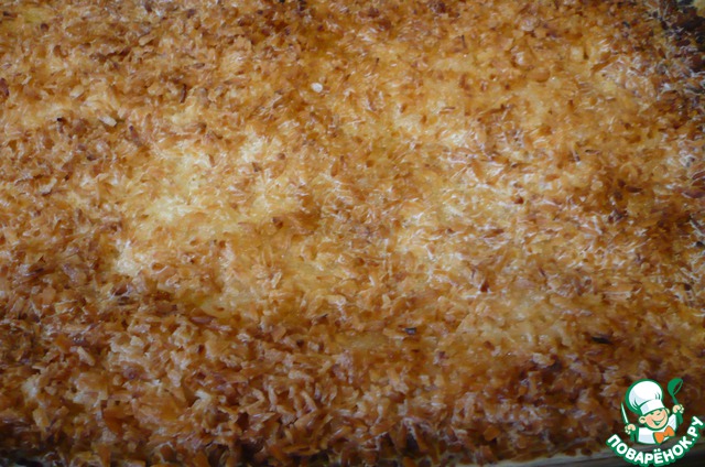 Ставим в духовку при t=200 на 10 мин. Вынимаем и покрываем с верху фольгой, чтобы кокос не пригорел.