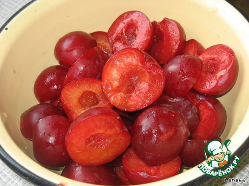 Сливы помыть, разделить на две половинки и очистить от косточек.
