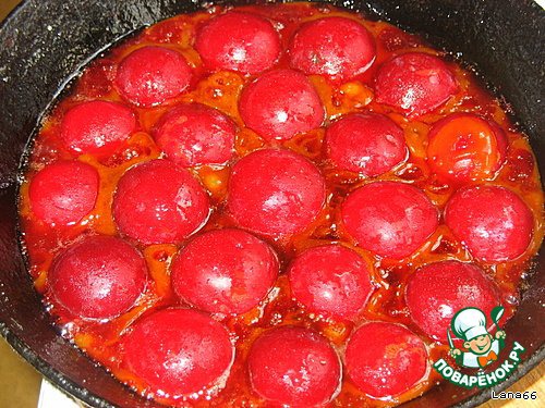 Дольки слив уложить плотно в карамель, слегка прижимая ко дну сковородки.
