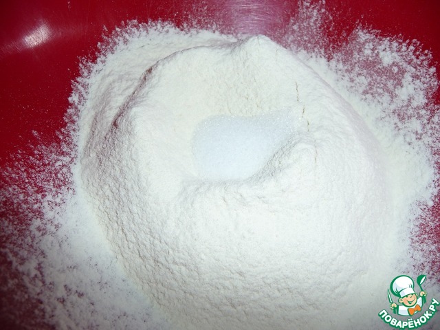 В отдельной миске смешайть просеянную муку, соль, сахар.