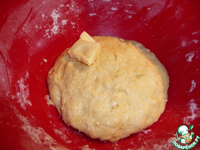 Отдохнувшее тесто помесить 3 – 4 мин., а затем постепенно вмесить размягченное сливочное масло комнатной температуры.