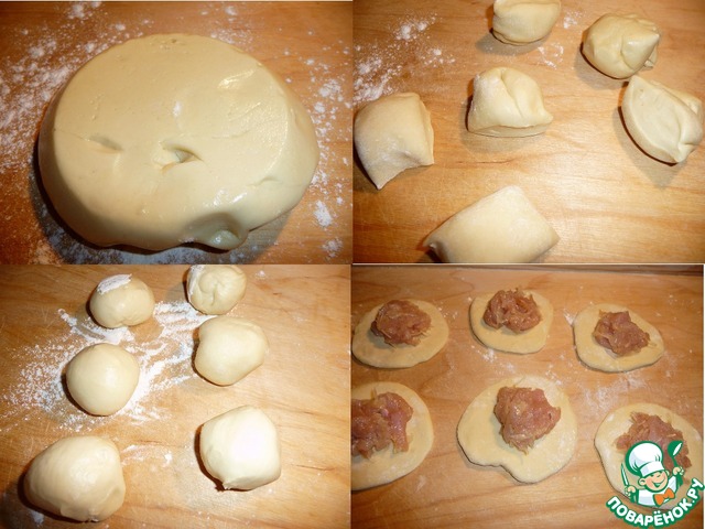 Холодное тесто, свернуть в валик и поделить на части, у меня 6 шт. Сформировать шарик. Раскатать каждый в лепешку, не очень тонко. Выложить начинку. Фарш приготовила перед выемкой теста из холодильника. Филе куриной грудки мелко порезать. К фаршу добавить мелко порезаный лук, соль, перец.