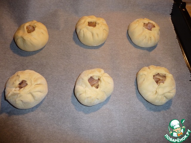 Защипнуть края, оставляя небольшое отверстие. Выложить на противень, застеленный пекарской бумагой. Накрыть пленкой или миской и убрать в теплое место на 2,5 часа.