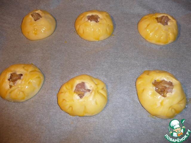 За 5 мин перед выпечкой смазать пироги желтком. Печь в разогретой духовки до 200С 20 - 25 мин. После выпечки накрыть пироги пекарской бумагой и полотенцем на 10 мин.