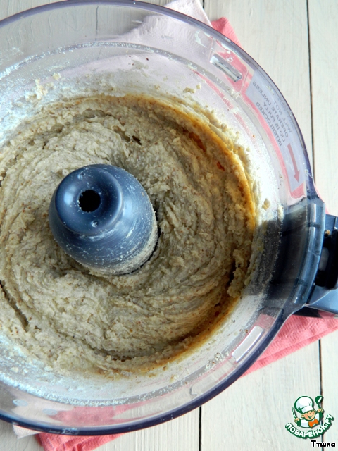 В другую миску или, как я, в комбайн, насыпать миндальную муку (я смолола миндаль в кофемолке), 50 г сахарной пудры и сливочное масло, размешать до однородности, используя миксер или комбайн.