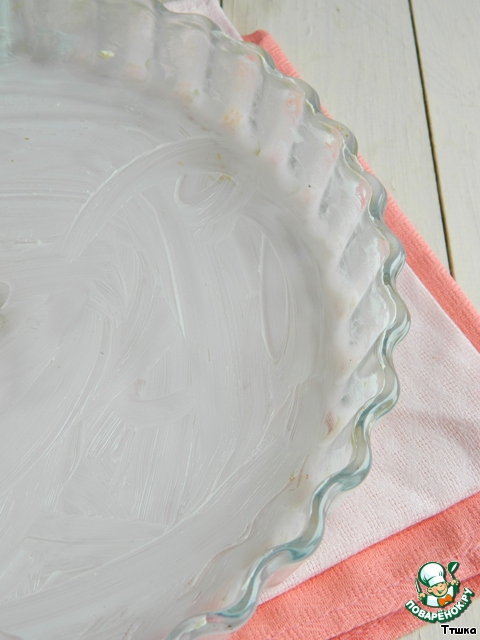 Жаропрочную форму диаметром 32 см (у меня была 30 см, поэтому пирог вышел более высокий, чем должен быть) смазать сливочным маслом.
