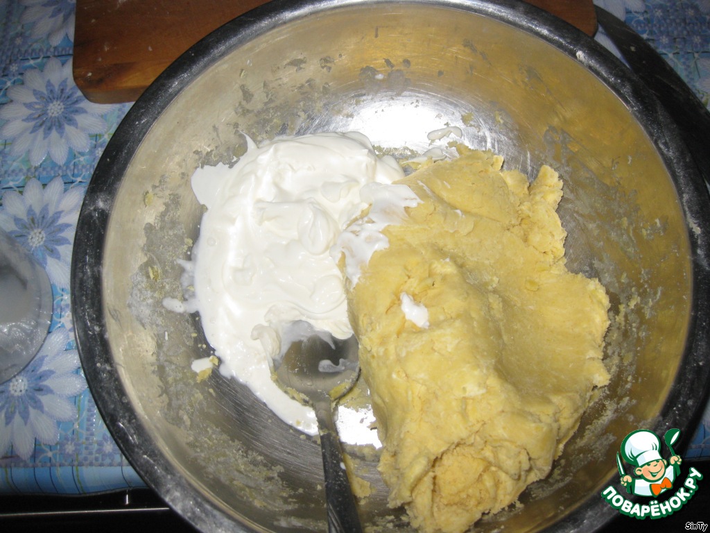 Вымесить довольно густое тесто, в конце вмесить в него сметану.