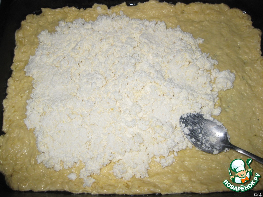 Противень смазать маслом и выложить тесто, на тесто - творог, смешанный прямо перед укладкой на тесто с 1 желтком и 1/2 стакана сахара.