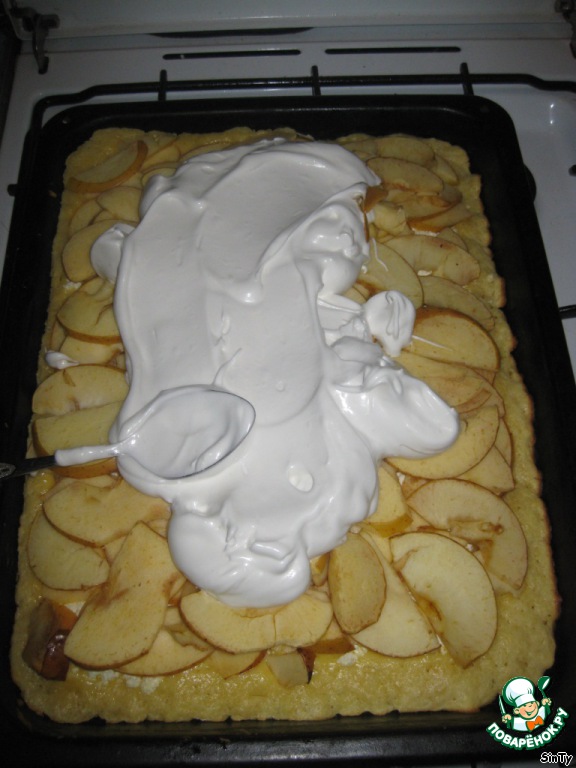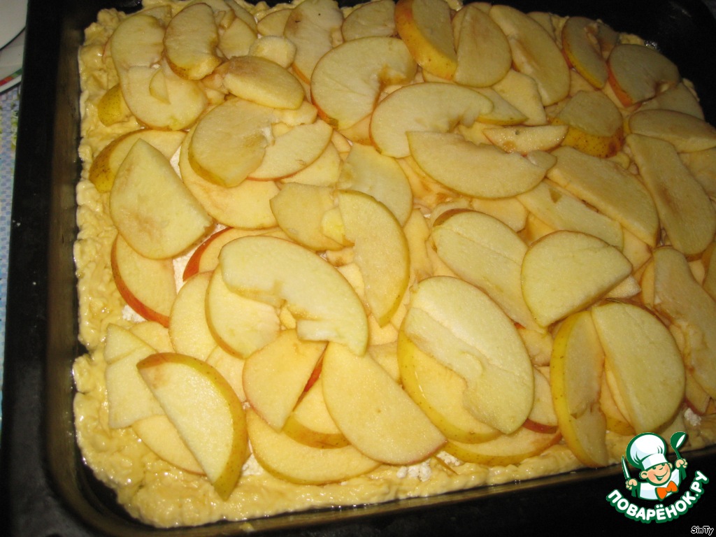 Выложить поверх всего яблоки и выпекать 10 минут при температуре 180-200 градусов в заранее разогретой духовке.