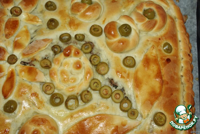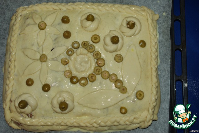 Украсить оливками, смазать желтком