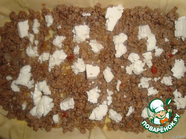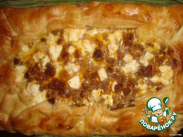 Тесто раскатать и положить в небольшую прямоугольную форму 33х20 см. Края теста должны свисать.