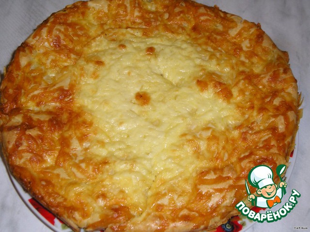 В сковороду выливаем половину теста, потом начинка. Сверху на начинку режем сливочное масло, потом остальное тесто. Сверху трём сыр.