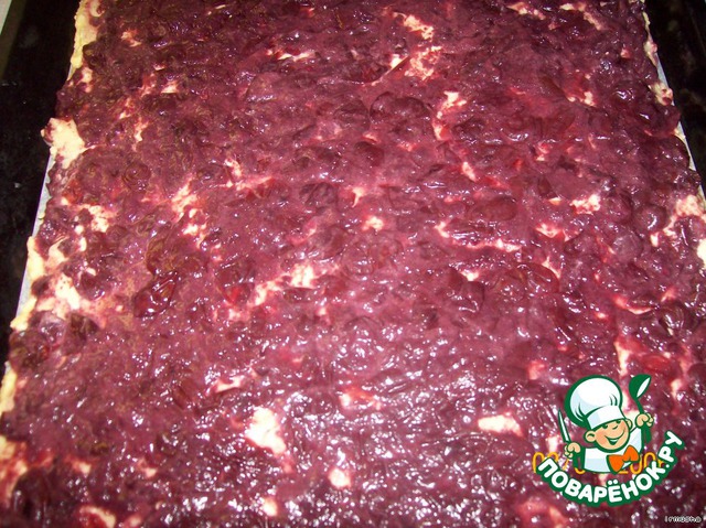 На тесто выложить вишню (у меня консервированная). Или то, что любите. Вкусно с тертыми яблоками, джемом. На усмотрение)