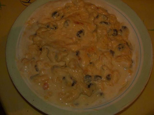 творог смещать с одним яйцом,100 г,сметаны,2 ст.л.изюма,вымоченным в роме,немного ванилина,немного сахара.