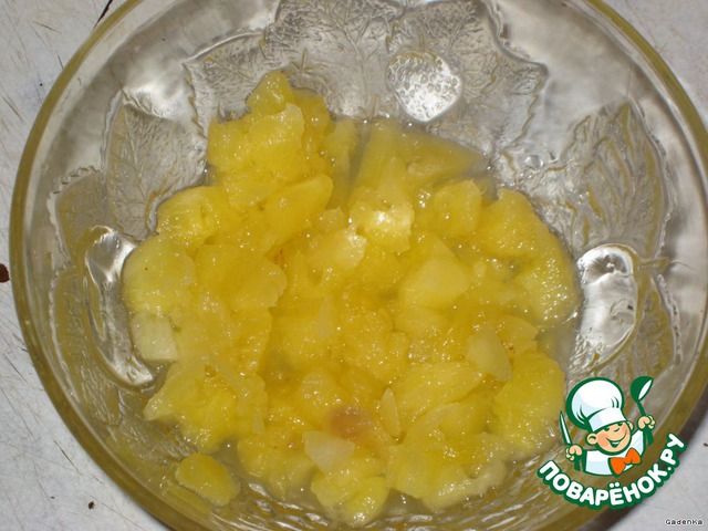 Яблоки очистить от кожуры, мелко порезать, смешать с ананасом, сбрызнуть лимонным соком и перемешать.