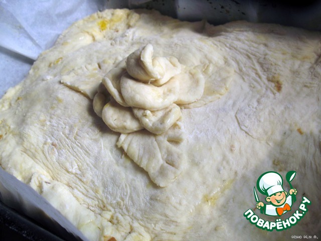 Oстальное раскатала на пирог. Если есть проблемка с липучестью - смело можно стол и скалку подпылить мукой.