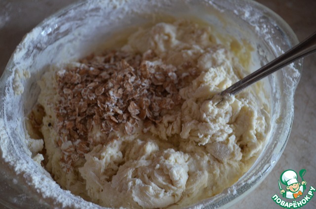 1 яйцо, простоквашу, соду, муку, 3 ст. л. хлопьев и соль по вкусу перемешиваем в мягкое и податливое тесто. Тесто не должно липнуть к рукам, но не в коем случае не должно быть твердым, иначе Ваши лепешки уже через полдня станут очень черствыми.