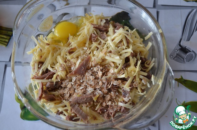 Отварное мясо утки нарезаем мелкими кусочками, сыр натираем на крупной терке. Смешиваем, добавляем 1 яйцо и 2 ст. л. хлопьев.