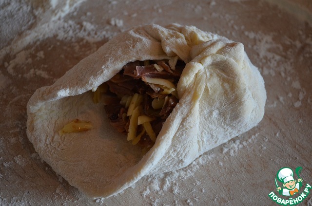 Рабочую поверхность слегка посыпаем мукой. Тесто делим на 4 шарика. Каждый шар раскатываем слегка в не очень тонкую лепешку. В середину лепешки выкладываем 1/4 начинки. Собираем лепешку в шар. Переворачиваем и аккуратно раскатываем лепешку с начинкой внутри. Тесто очень хорошее, с ним работать одно удовольствие. И даже маленькие помощники (моему сыну 2 годика) с легкостью справятся с раскатыванием лепешек. Им будет это не только в удовольствие, но и на пользу, т. к. ни для кого не секрет, что игры с мукой и тестом помогают развивать малышам тактильные ощущения и моторику.