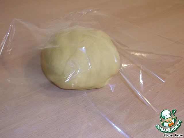 Замесить гладкое тесто, завернуть в пищевую плёнку и отправить охлаждаться на 30 минут.