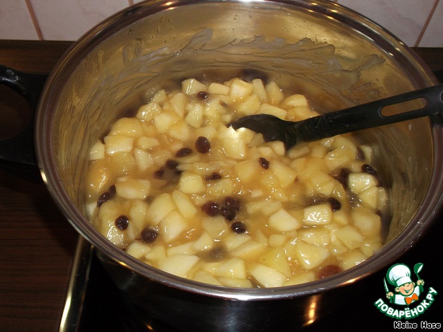 Изюм залить 2-мя ст.л. кальвадоса. Кальвадоса у меня не было, залила бренди.