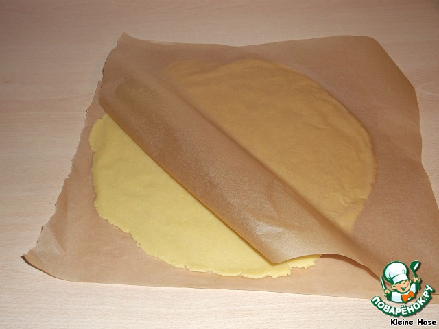 Большую часть теста раскатываем диаметром 32 см. Я раскатывала между двумя листами бумаги для выпечки - так гораздо удобней.