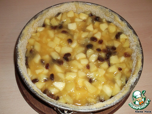 Накалываем вилкой и посыпаем сухарями. Равномерно сверху выкладываем яблочную начинку.
