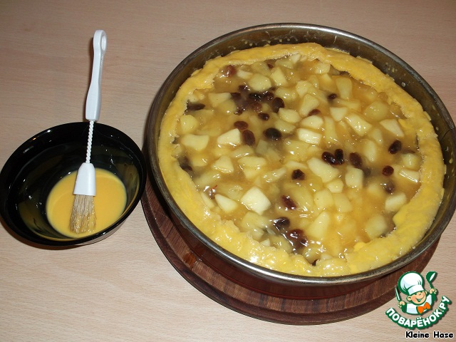 Свободные края бортов пирога прижимаем к яблокам и смазываем частью желтково-сливочной смеси.