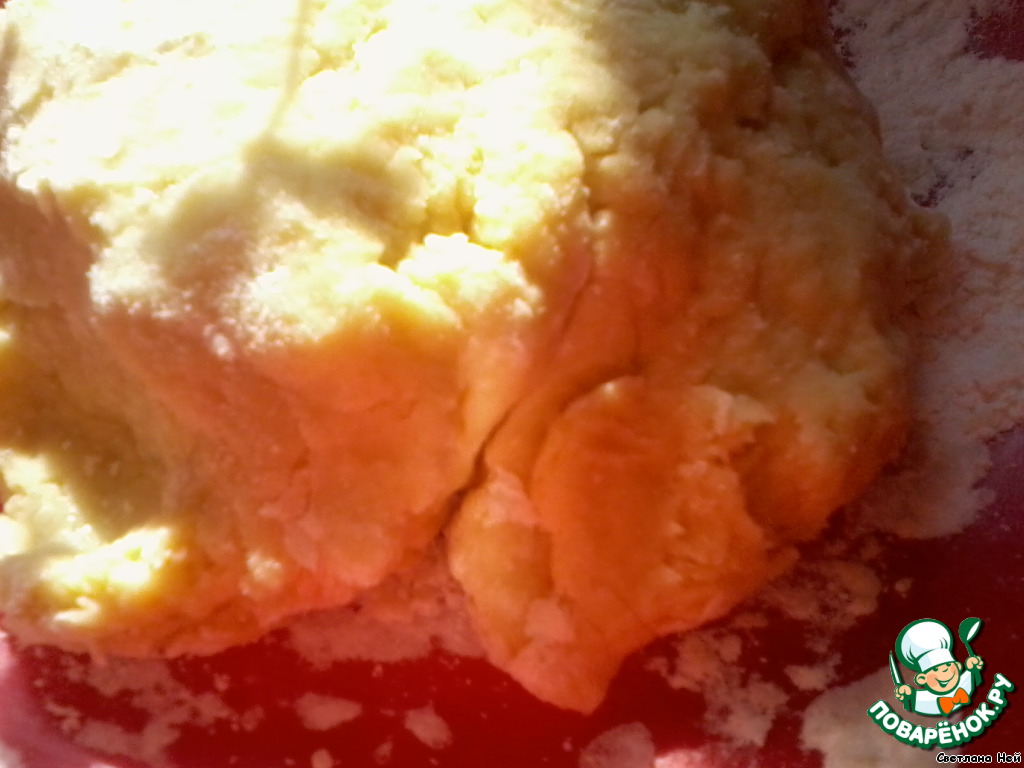 Белок одного яйца отделить от желтка и поставить в холодильник. Желток перемешать с мукой, солью, маслом кусочками и водой.