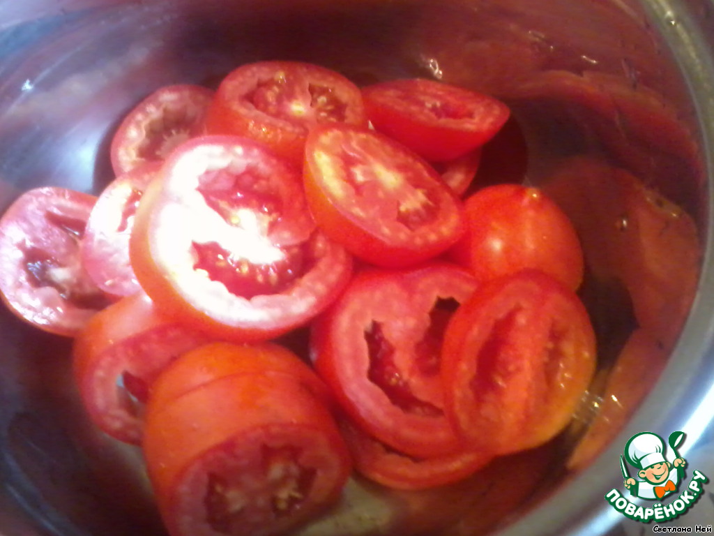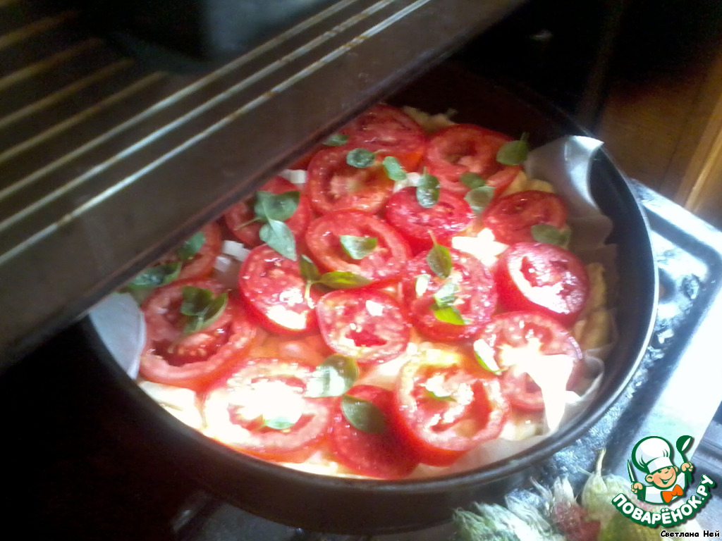 посыпать сверху луком, уложить томаты и посыпать листьями трав. Приправить солью и отправить в духовку чуть больше, чем на час.