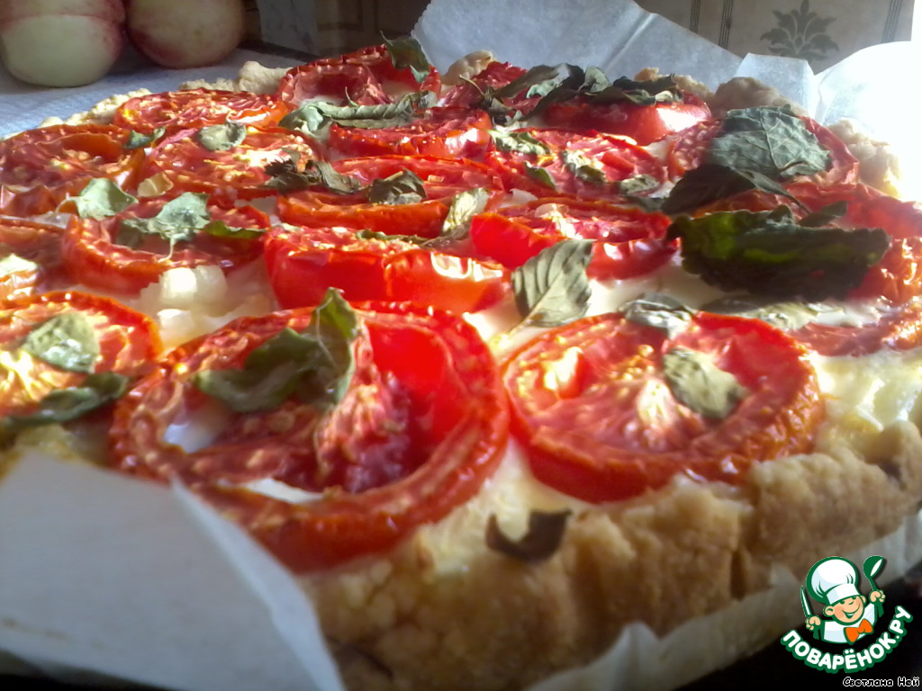 Открытый пирог с томатами, базиликом и мятой