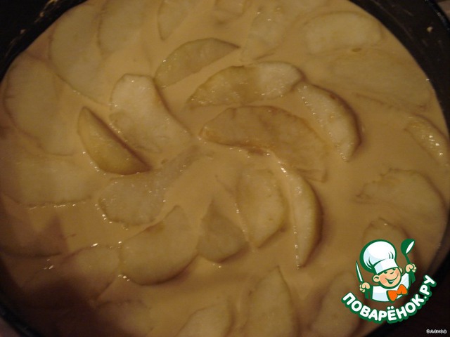 Груши очистить и нарезать тонкими ломтиками.Поверх теста выложить ломтики груши.
