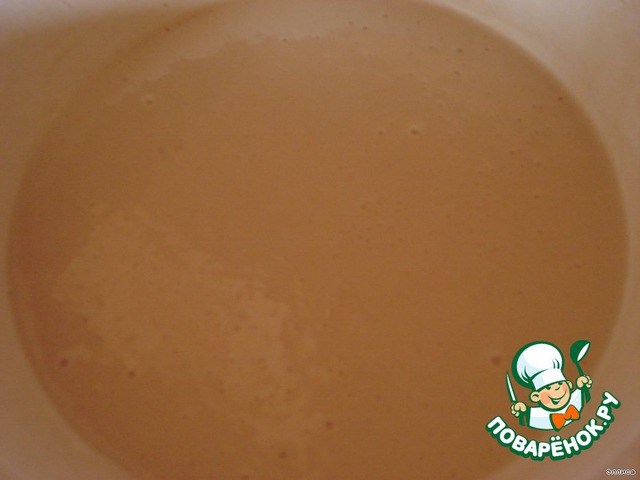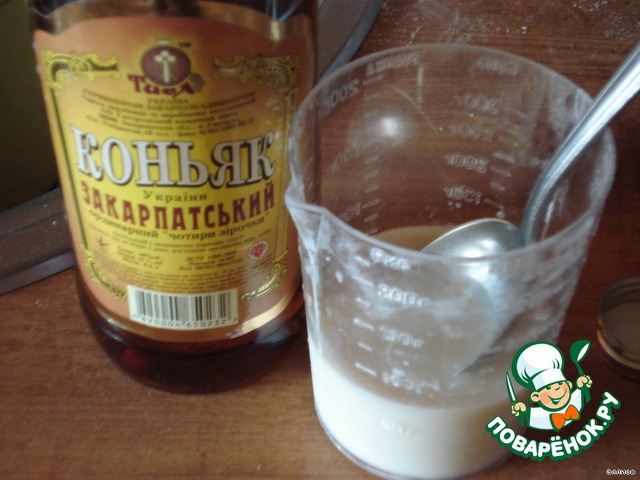 Довести до однородной массы. Оставшееся молоко соединить с коньяком и влить в полученную смесь, хорошо перемешать, накрыть и оставить на 2 часа.