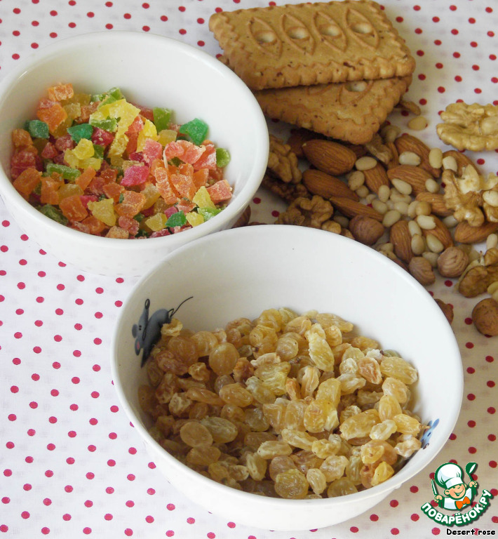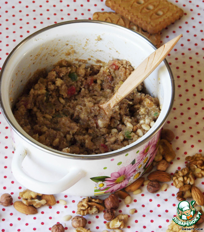 Промыть изюм несколько раз. Залить кипятком на пять минут. Слить воду, измельчить – в блендере или нарезать ножом мелко. Истолочь орехи, кроме кедровых, или нарезать их мелко. Печенье измельчить в крошку. Цукаты нарезать кубиками 5 на 5 мм.