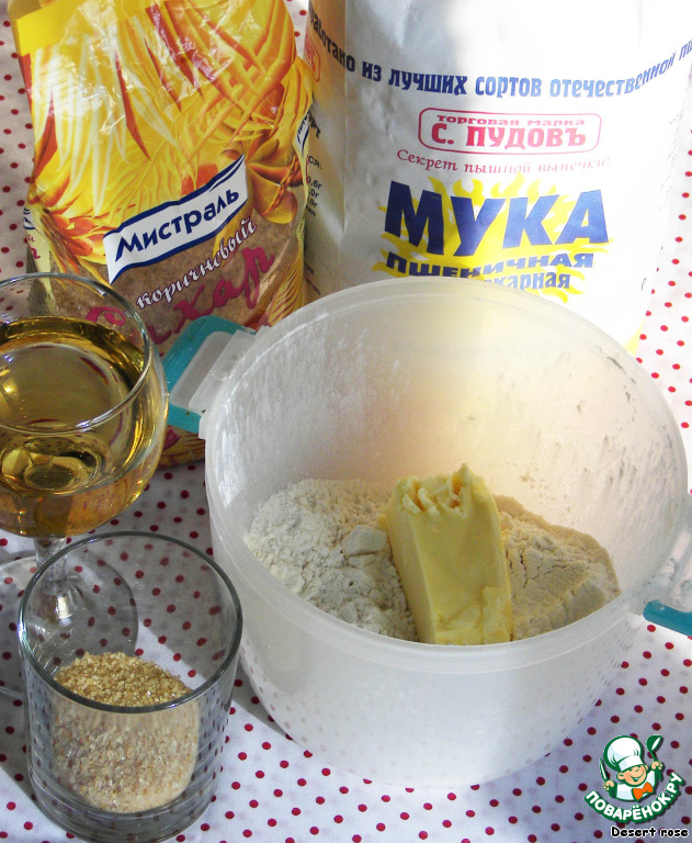 Приготовить тесто. Размять вилкой размягченное масло со стаканом муки. Добавить сахар и стакан белого вина. Размешать, добавить оставшуюся муку и замесить крутое тесто.