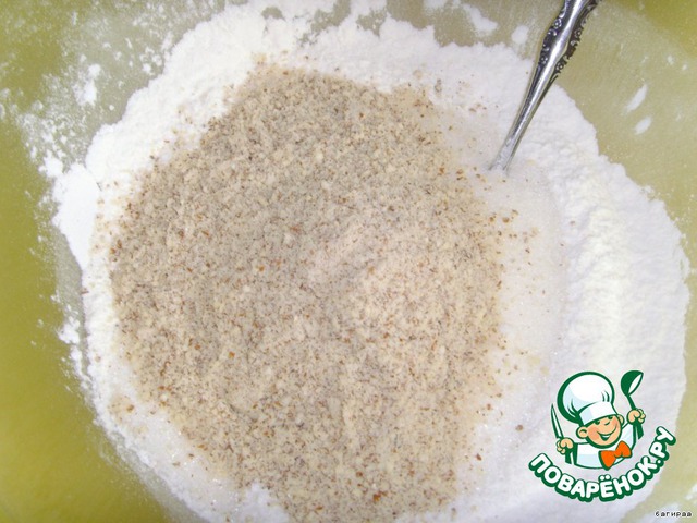 Муку смешать с разрыхлителем, сахаром, ванильным сахаром и молотым миндалем.