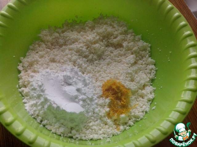 Творог размять. Вмешать крахмал и лимонную цедру (чем более влажным будет творог, тем больше крахмала нужно в него добавить). Перемешать.