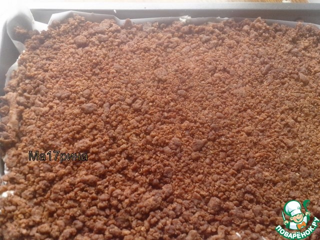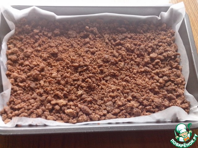 Прямоугольную форму ( 16*25) или круглую ( d=22~24см) застелить изнутри бумагой для выпечки. На дно формы высыпать половину теста. Разровнять, но не приминать.