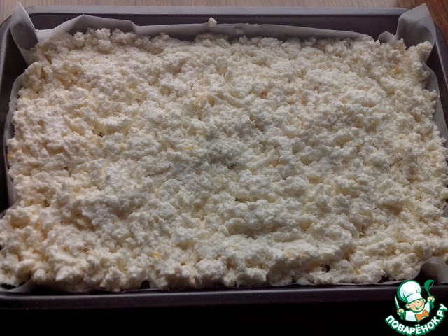 Во время выпекания творог может немного подняться буграми, приподнимая верхний слой теста и образуя в нём трещины. Но после остывания всё выровняется.