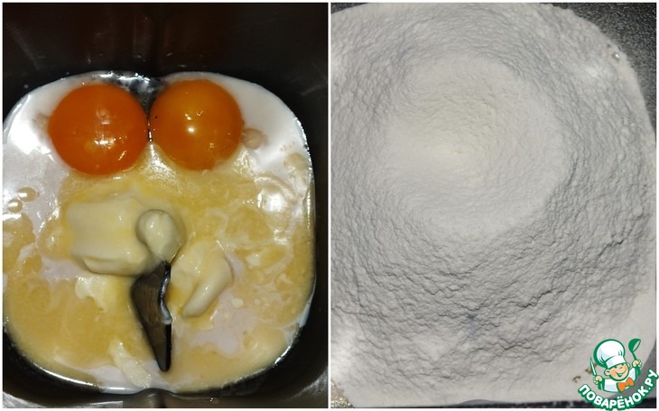 Вылить в ведерко х/п. Туда же добавить желтки, растопленное масло, соль, сахар и муку. Поставить на режим замеса теста.