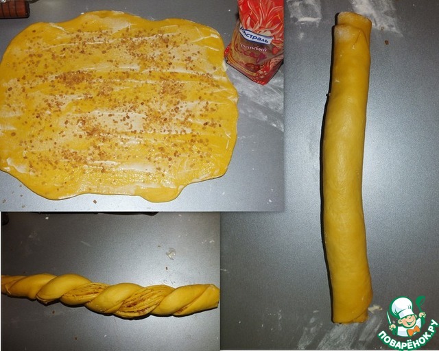 По готовности выложить тесто на припыленный мукой стол, раскатать в пласт, смазать мягким маслом и посыпать коричневым сахаром. Пласт свернуть в рулет и затем разрезать вдоль на 2 части. Каждую часть свернуть в жгут. Жгуты соединить между собой, сформировав тем самым калач.