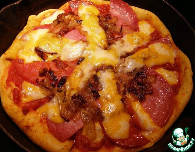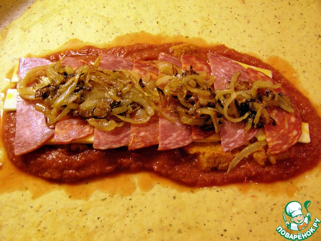С этими ингридиентами и пицца очень хороша. Сначала лепешку промазать томатной пастой, затем тыквенным пюре, сыр, потом нахлёст салями друг на друга, чередуя сорта, не оставляя пустого места, жаренный лук и опять сыр. Все запечь и пицца готова.